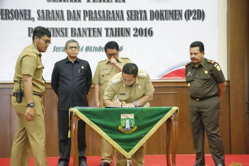 Wali Kota Tangerang, Arief Rachadiono Wismansyah, menandatangani Berita Acara Serah Terima Personil, Sarana, Prasarana dan Dokumen (P2D) bersama delapan...