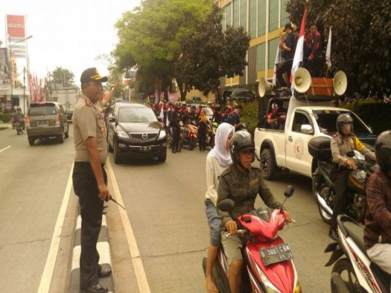 Kapolsek Jatiuwung Mengawal Massa FSPMI Yang Berangkat Menuju Kantor Disnakertrans Kab. Tangerang
