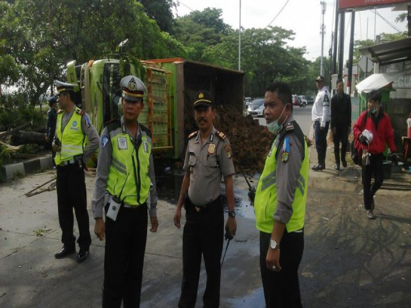 Wakapolsek bersama Kanit Lantas Polsek Neglasari alihkan arus Lalu Lintas akibat truk terbalik di Jalan Suryadharma Neglasari