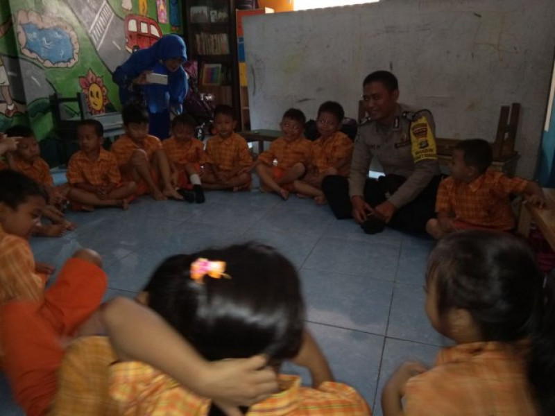 Bhabinkamtibmas Kelurahan Batu sari Brigadir Joni menyambangi murid sekolah Paud Melati