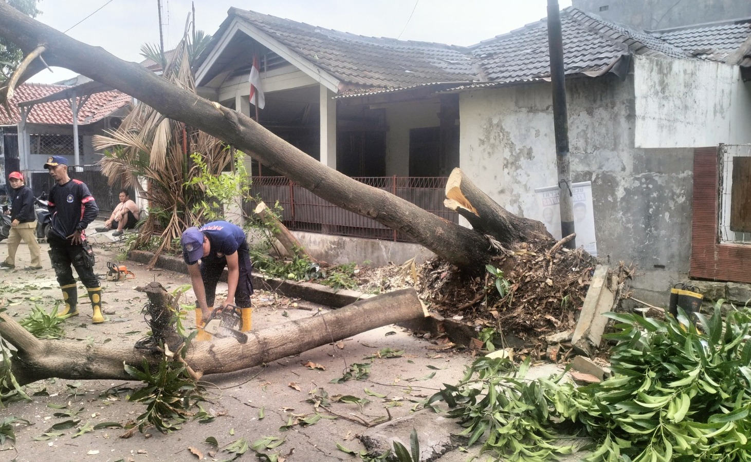 Respons cepat dilakukan petugas Unit Pelaksana Teknis (UPT) Pemadam Kebakaran dan Penyelamatan Korban Ciledug, Kota Tangerang untuk melakukan penanganan pohon...