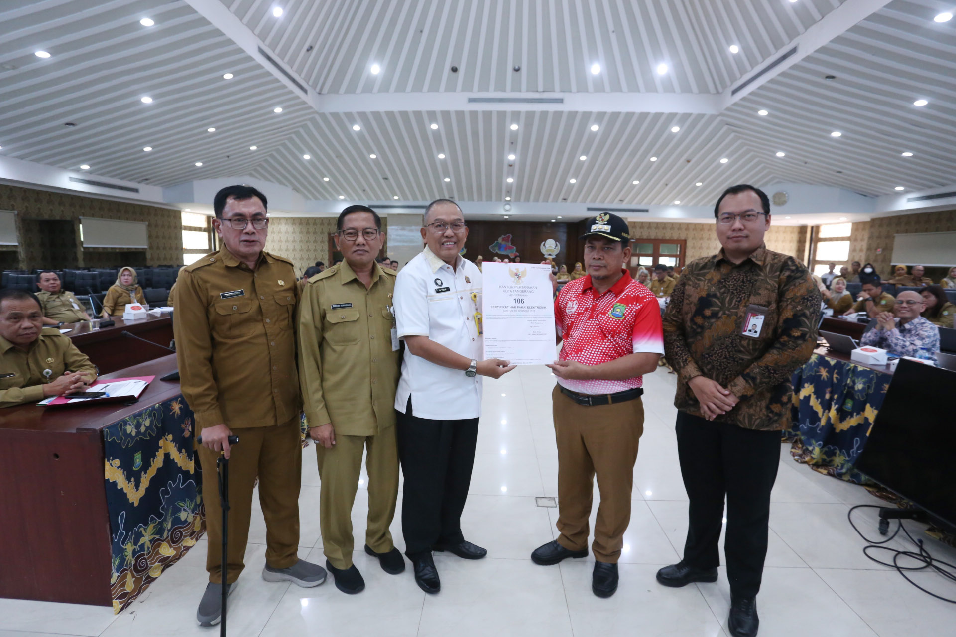Pemerintah Kota (Pemkot) Tangerang menerima 106 Sertipikat Hak Pakai Elektronik dari Kantor Pertanahan (Kantah) Kota Tangerang yang diterima secara simbolis oleh...