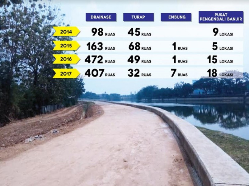 Lalu pada tahun 2017 kemudian dilaksanakan lagi beberapa fokus pembangunan seperti drainase di 407 ruas drainase, 32 lokasi turap, lima unit pintu air, tujuh embung dan delapan belas pusat pengendali banjir.