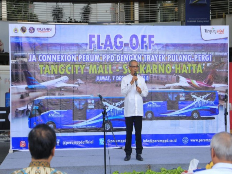 Badan Pengelola Transportasi Jabodetabek (BPTJ) bersama Perusahaan Umum (Perum) Pengangkutan Penumpang Djakarta (PPD) dan Dinas Perhubungan Kota Tangerang serta Tangcity Mall meresmikan Bus JA Connexion (Jabodetabek Airpot) , di Lobby Perintis Tangcity Mall, Jumat (7/12).