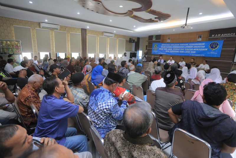 Wali Kota Tangerang Arief R. Wismansyah didampingi Sekretaris Dinas Perhubungan Wahyudi Iskandar membuka kegiatan Sosialisasi Pembayaran Non Tunai BRT Trans Kota Tangerang di Aula Kecamatan Karawaci, Rabu (11/9).