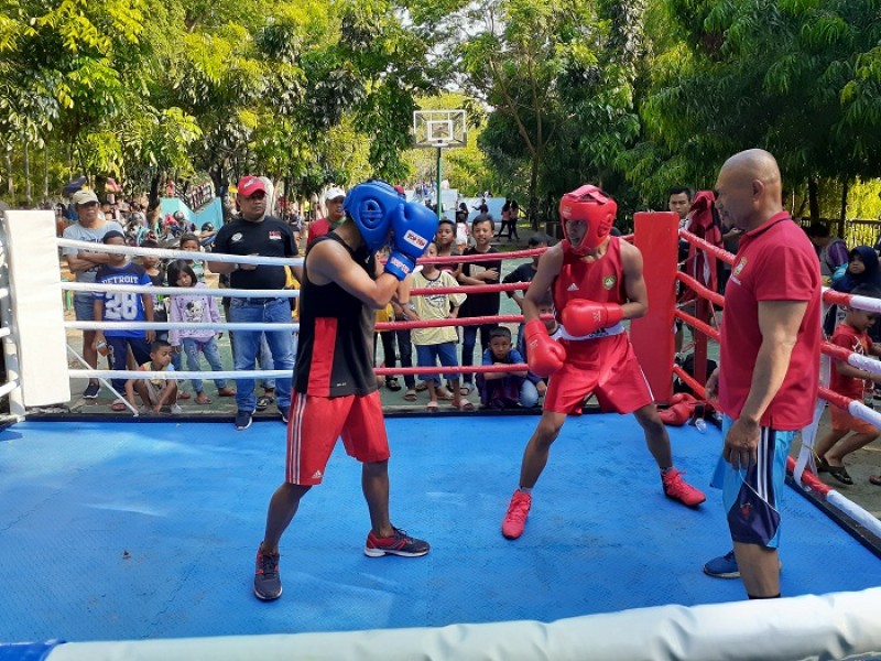 Empat petinju Pra PON 2 Banten melakukan latih tanding di arena Car Free Day (CFD), arena ring portabel, Jalan M. Yamin Kecamatan Tangerang, Minggu (1/12/2019). Empat atlet tinju Pra PON itu yakni Michael Romroman, Benitus Rumahpasal (Kota Tangerang) berlatih melawan petinju Kota Cilegon, Ari Rudi Setiawan dan Yudi Kurniawan.