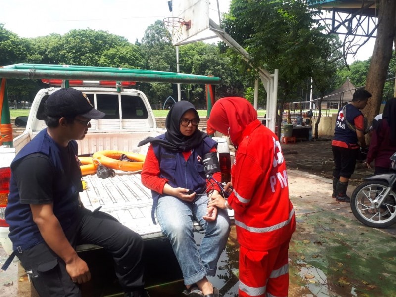 PMI Kota Tangerang melakukan pemeriksaan kesehatan penyintas dan para relawan yang bertugas dalam membantu evakuasi banjir.