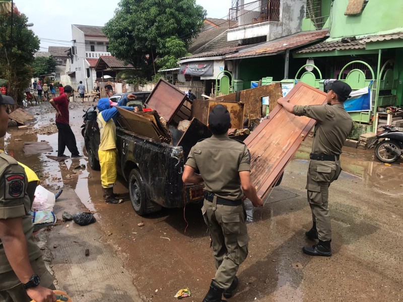 Sebanyak 221 titik banjir Kota Tangerang telah surut dan kering. Dalam rangka menjaga keamanan dan ketertiban lingkungan, Personil Satpol PP Kota Tangerang tetap bersiaga di lokasi tersebut.