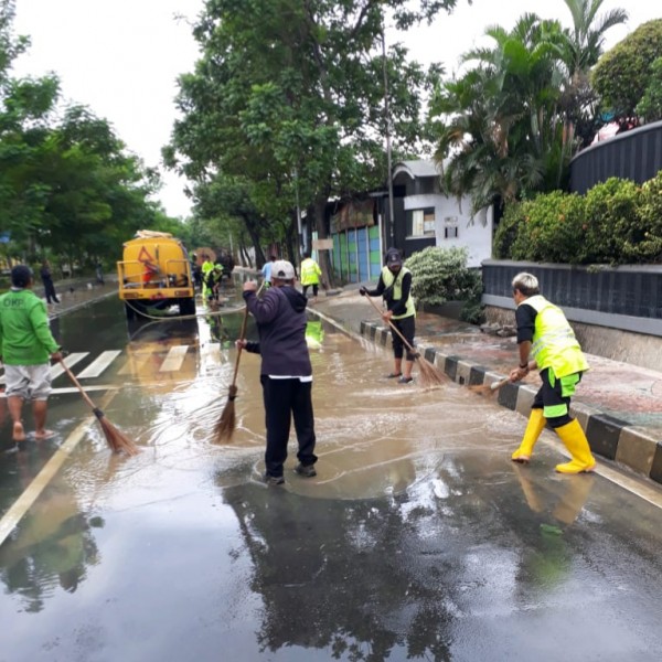 Bidang Pertamanan pada Dinas Kebudayaan dan Pariwisata Kota Tangerang mengerahkan delapan tangki untuk membersihkan dan penyemprotan jalan dari lumpur pasca banjir surut.
