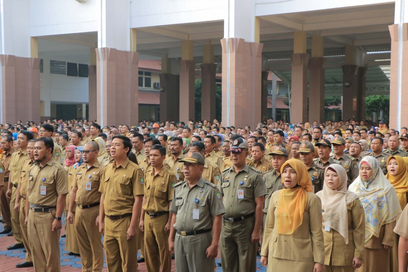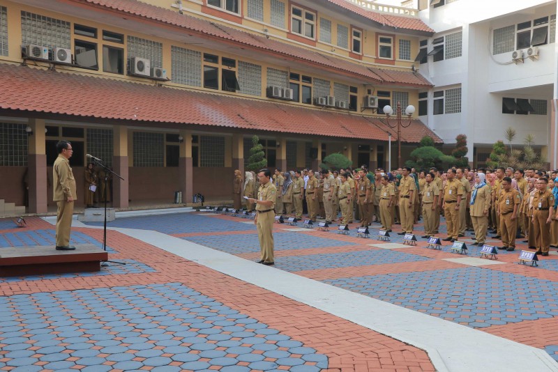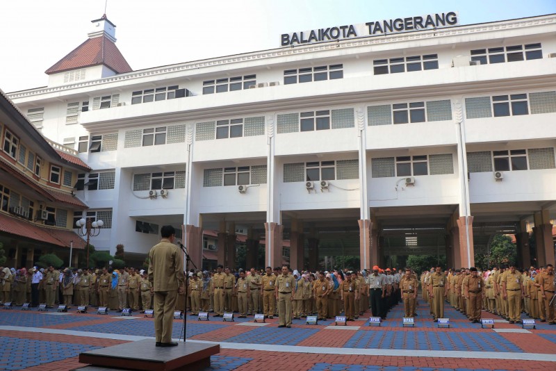 Sekretaris Daerah Kota Tangerang H. Dadi Budaeri menegur pegawai yang tidak disiplin mengenakan kelengkapan atribut saat melakukan Apel Pagi di Lapangan Apel Gedung Pusat Pemerintah Kota Tangerang, Senin (24/06).