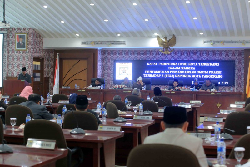 Sebanyak sembilan fraksi di Dewan Perwakilan Rakyat Daerah (DPRD) Kota Tangerang menyampaikan pandangan umumnya terhadap 3 (tiga) Rancangan Peraturan Daerah (Raperda) pada Rapat Paripurna yang digelar di Ruang Rapat Paripurna DPRD Kota Tangerang, Rabu (13/3).