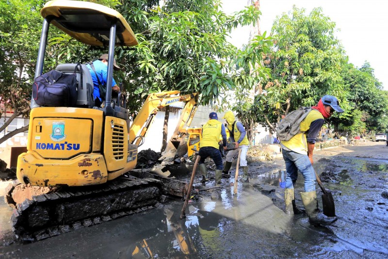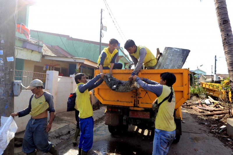 "Ibu rumahnya yang mana, biar dibantu bersihkan sama petugas kita," tanyanya lagi pada seorang ibu yang duduk didepan rumah.