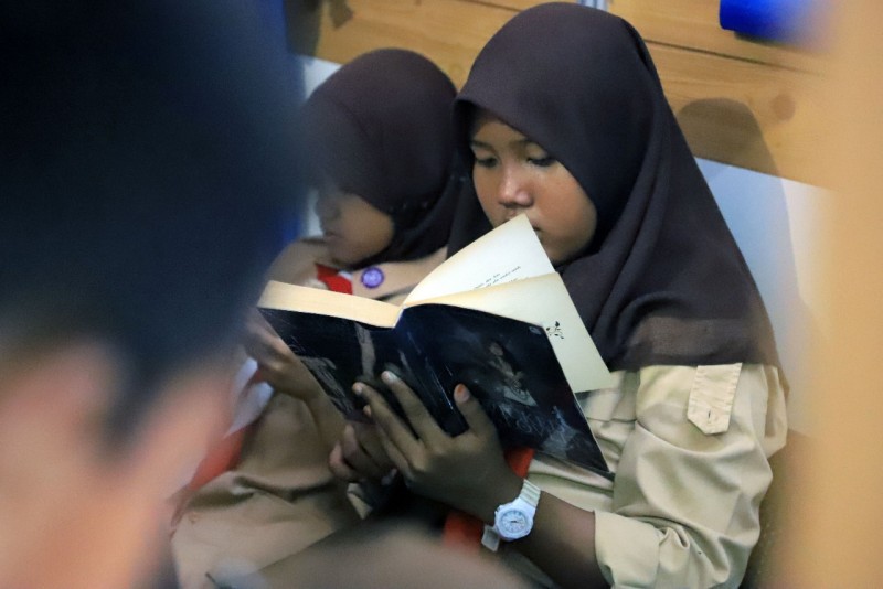 Stan Pojok Baca Dindik, salah satu stan yang memiliki daya tarik tersendiri. Terlebih bagi ratusan pelajar yang tak henti meramaikan stan Pojok Baca sejak pagi hingga sore.