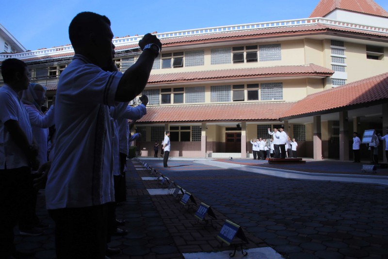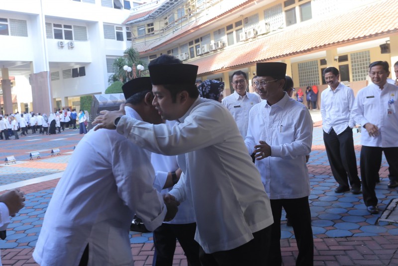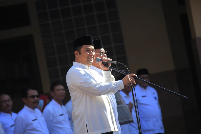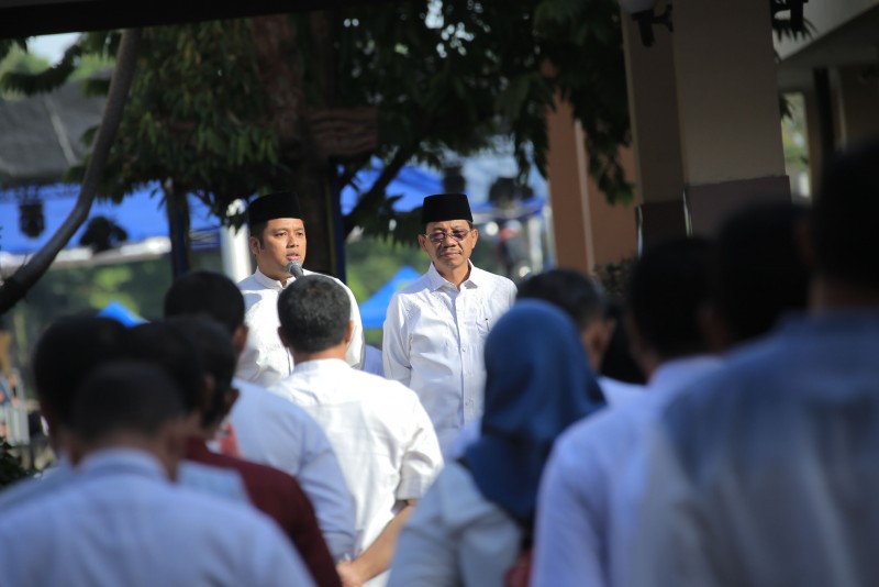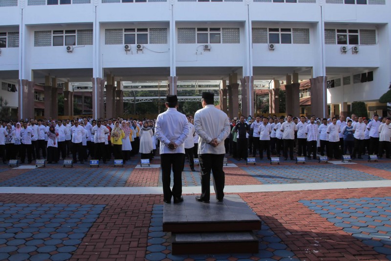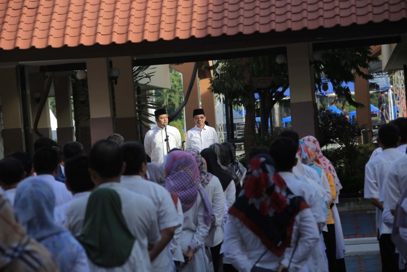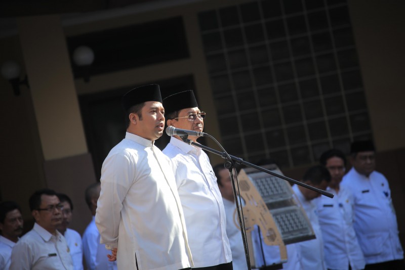 Wali Kota Arief R. Wismansyah bersama dengan Wakil Wali Kota Sachrudin berpamitan kepada para pejabat dan juga pegawai di lingkup Pemerintahan Kota (Pemkot) Tangerang saat melaksanakan Apel Pagi Pegawai, Jum'at (21/12/2018).