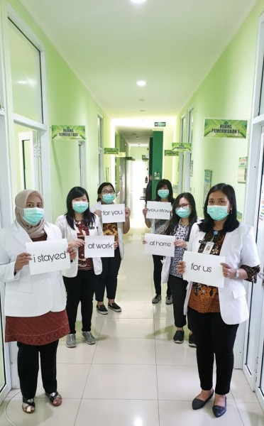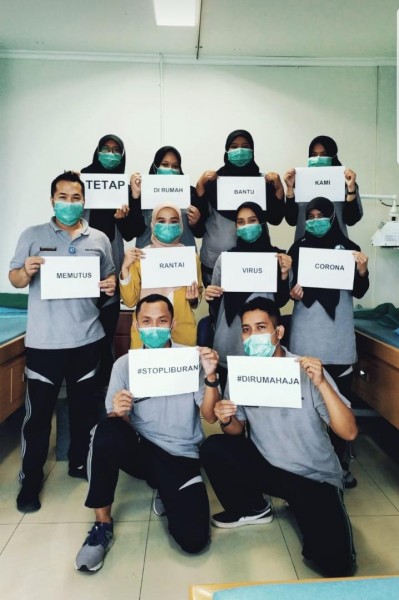 "I stayed at work for you, you stay at home for us". "Tetap di rumah bantu kami, memutus rantai virus corona, #stopliburan #dirumahaja".