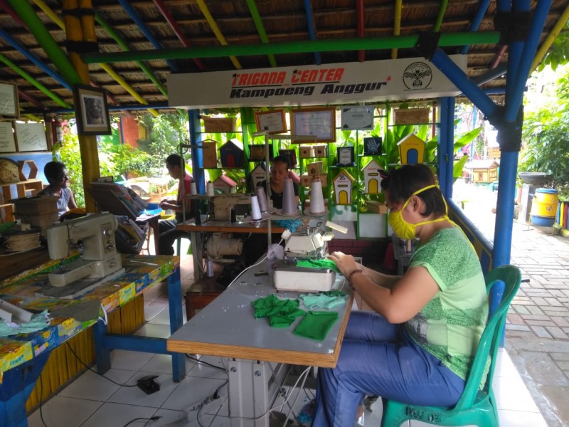 "Karena warga di sini banyak yang bekerja di koveksi dan bisa membuat masker, akhirnya kami buat. Alhamdulillah bahan dan mesin jahit dari sumbangan warga," jelasnya.