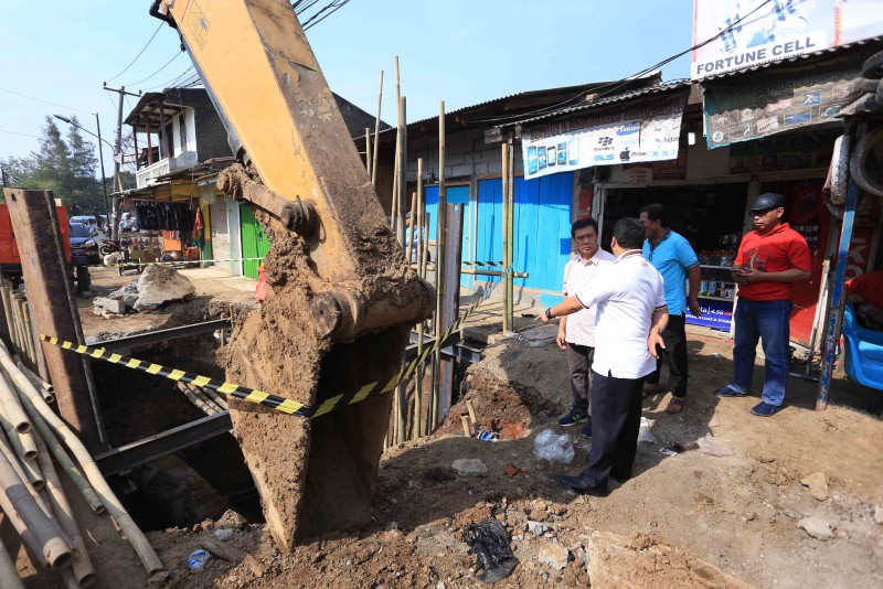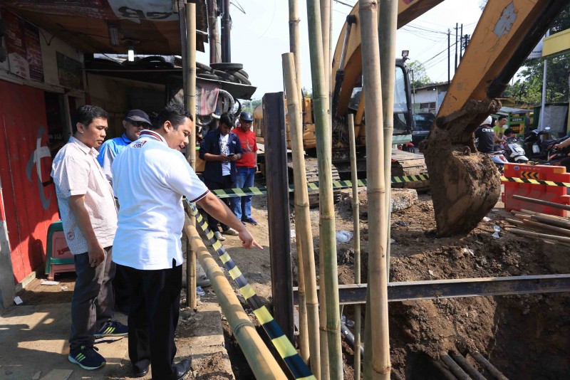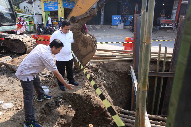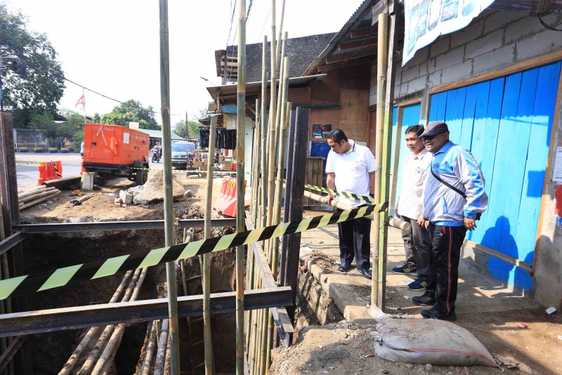 Wali Kota Tangerang H. Arief R. Wismansyah meninjau lokasi bocornya pipa Jaringan Distribusi Utama (JDU) milik PDAM Tirta Benteng di Jl. Halim Perdana Kusuma, Kebon Besar, Batuceper, Kota Tangerang, Minggu (16/9).