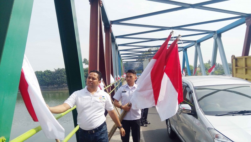 Selepas dari situ, Wali Kota kemudian menuju Jembatan Pelangi yang menghubungkan Jl. KS Tubun dan Jl. Daan Mogot. Melihat para petugas yang sedang sibuk memasang bendera di sepanjang jembatan, Wali Kota pun turun dari losbak untuk membantu memasang bendera merah putih.