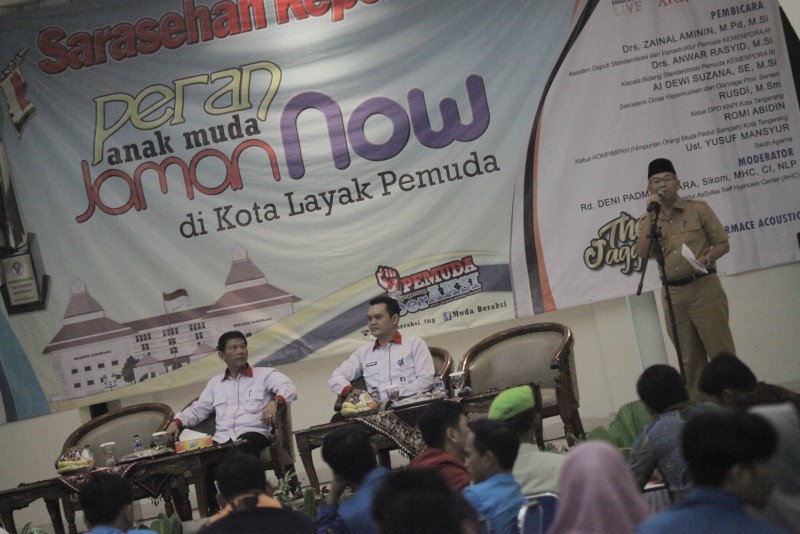 Sebagai informasi, acara Sarasehan Kepemudaan tersebut dikemas dengan talkshow interaktif yang menghadirkan narasumber diantaranya Drs. Zainal Aminin, M.Pd, M.Si (Asisten Deputi Standarisasi dan Infrastruktur Pemuda Kemenpora RI), Drs. Anwar Rasyid, M.Si (Kabid Standarisasi Pemuda Kemenpora RI), Ai Dewi Suzana, SE, M.Si (Sekretaris Dispora Provinsi Banten), Rusdi, M.Sm (Ketua DPD KNPI Kota Tangerang), Romi Abidin (Ketua Himpunam Orang Muda Peduli Sampah), serta ulama kondang Ust. Yusuf Mansyur.