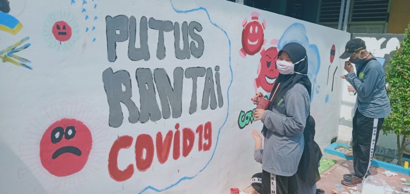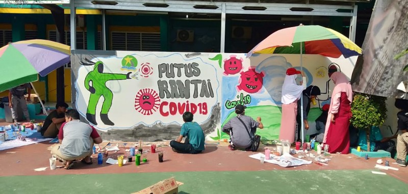 Dengan menerapkan protokol kesehatan, belasan siswa sekolah dasar dan menengah ini mulai mengisi kanvas putih berukuran 5X2 meter dengan cat beraneka warna. Di mana, untuk lomba kali ini panitia mengangkat tema memutus mata rantai covid 19.