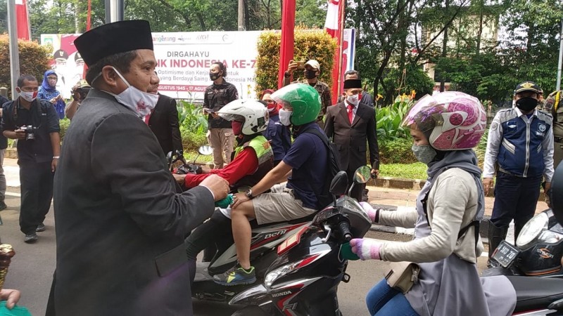 Memperingati Hari Ulang Tahun (HUT) ke-75 Kemerdekaan Republik Indonesia, Pemerintah Kota Tangerang menggelar Gebrak Masker di depan gerbang Puspem dengan menyebar 10 ribu masker secara gratis, Senin (17/8/20).