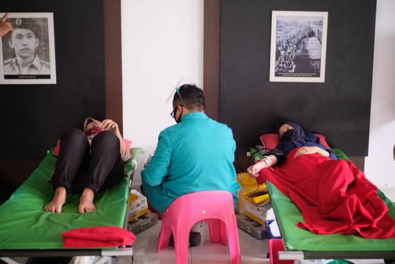 Dalam rangka memperingati World First AIDS dan HUT. PMI ke-75, Palang Merah Indonesia (PMI) Kota Tangerang bersama Komunitas Taman Potret (Kotret), menggelar Workshop Pertolongan Pertama dan donor darah di Museum Juang Taman Makam Pahlawan (TMP) Taruna, Minggu (13/9/2020).