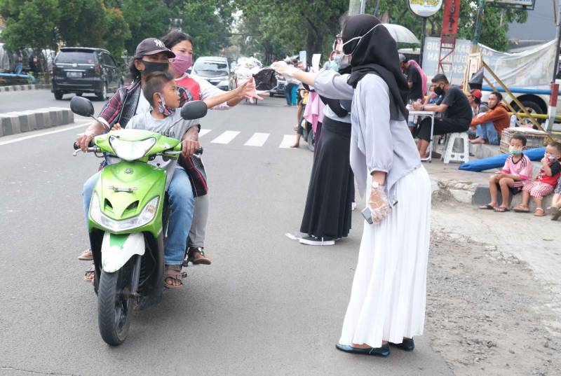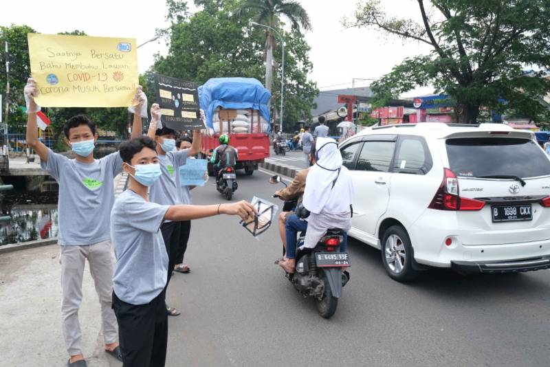 Mereka juga membagikan ratusan masker gratis kepada pengendara yang melintas di Jalan Hasyim Ashari, dan Jalan Maulana Hasanudin.