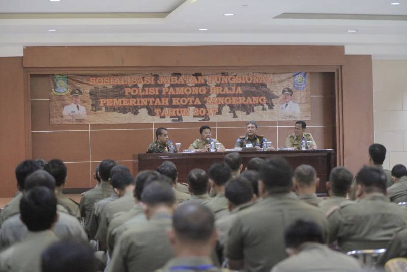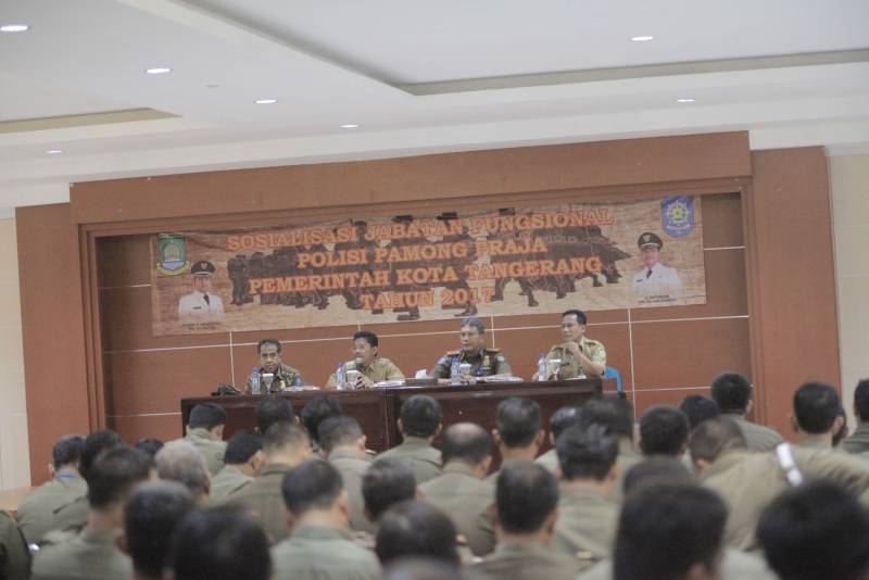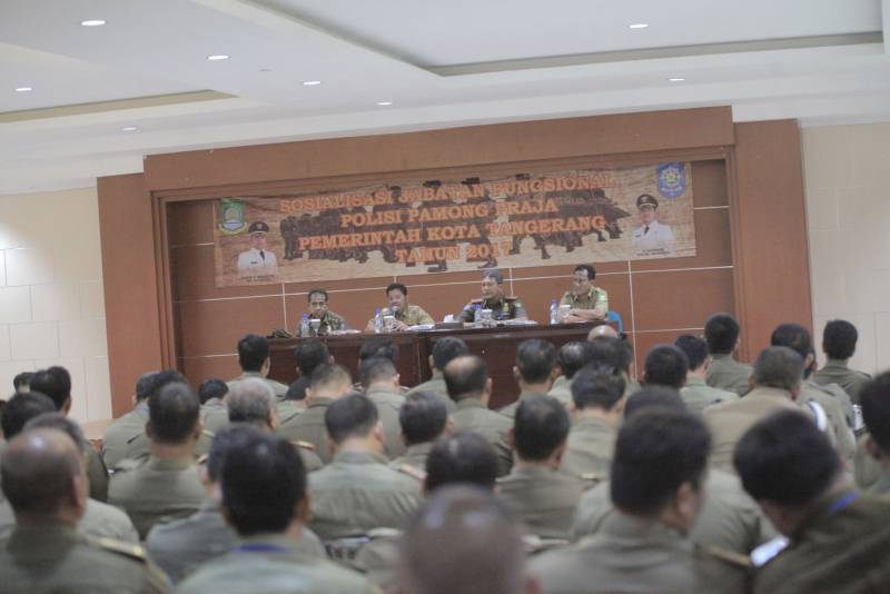 Untuk diketahui, kegiatan sosialisasi ini diikuti sebanyak 135 pegawai Satpol PP Esselon III dan IV di lingkup Pemerintah Kota Tangerang dengan materi yang diberikan antara lain Gambaran Mengenai Jabatan Fungsional Polisi Pamong Praja, Pembekalan Mengenai Penyesuaian Jabatan, serta Pembekalan Pengetahuan dan Pemahaman tentang Angka Kredit Jabatan Fungsional Polisi Pamong Praja.