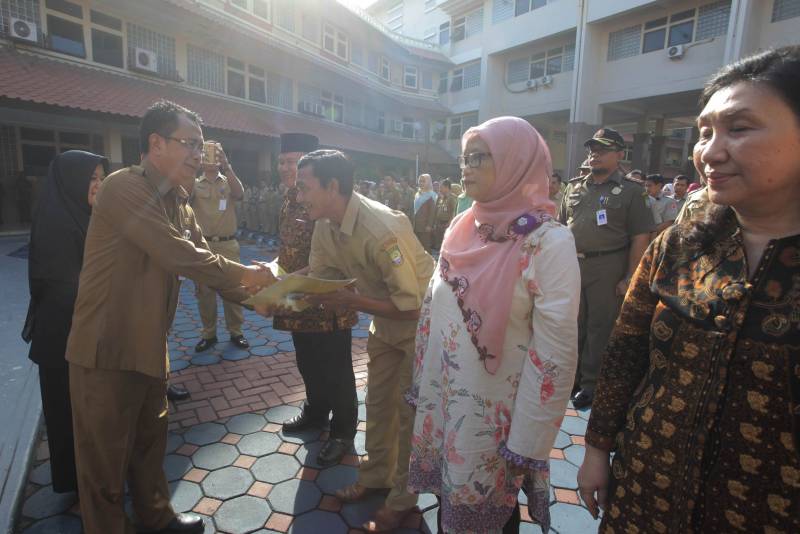 Dalam kesempatan tersebut, Sekda didampingi oleh Kepala BKPSDM Drs. H. Akhmad Lutfi Kota Tangerang, memberikan SK Pensiun Tepat Waktu bagi 5 (lima) orang pegawai yang sudah sampai pada masa Batas Usia Pensiun (BUP).