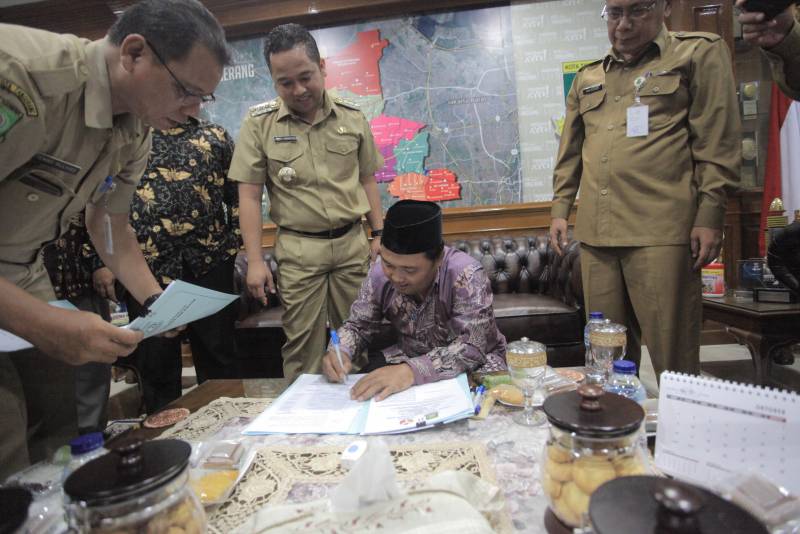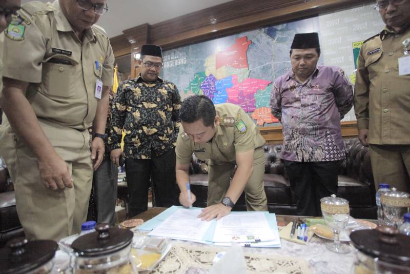 Penandatanganan dilakukan oleh Wali Kota Tangerang, H. Arief R. Wismansyah, bersama dengan Ketua Panwaslu Kota Tangerang Agus Muslim di Ruang Rapat Wali Kota, Gedung Pusat Pemerintahan Kota Tangerang, Senin (23/10).