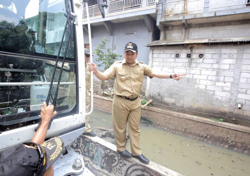 Selepas dari wilayah Larangan, Wali Kota selanjutnya menuju daerah Lembang Ciledug untuk meninjau pengerukan lumpur di Kali Irigasi Lembang.