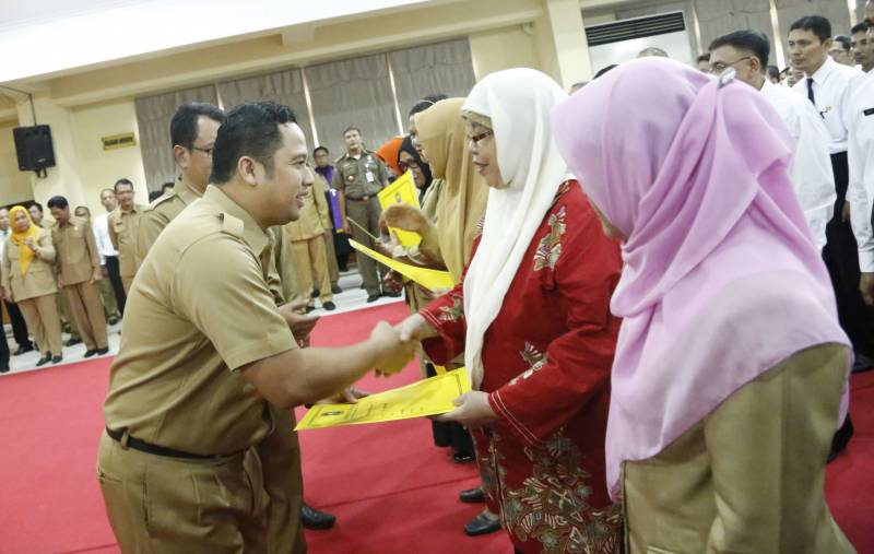 Wali Kota Tangerang, Arief Rachadiono Wismansyah, menyerahkan Surat Keputusan (SK) Pegawai Negeri Sipil (PNS) secara simbolik kepada tiga orang perwakilan Calon Pegawai Negeri Sipil (CPNS) dari golongan I, II, III formasi tahun 2014 sekaligus Penyerahan SK Pensiun Tepat Waktu kepada 14 pegawai, di Ruang Al Amanah, Selasa (28/06).
