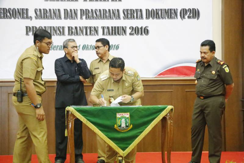 Wali Kota Tangerang, Arief Rachadiono Wismansyah, menandatangani Berita Acara Serah Terima Personil, Sarana, Prasarana dan Dokumen (P2D) bersama delapan (8) kepala daerah kabupaten dan kota di Provinsi Banten, yang berlangsung di Pendopo Gubernur Kawasan Pusat Pemerintahan Provinsi Banten (KP3B), Serang, Senin (24/10).