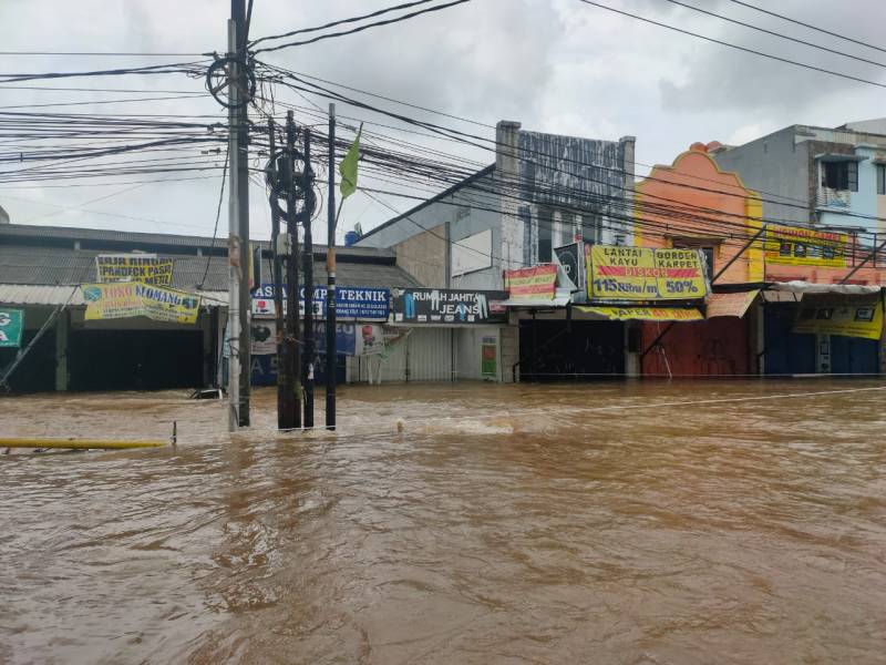 Banjir yang diakibatkan luapan anak kali angke membanjiri jalan raya dengan ketinggian bervariasi hingga 1,5 meter dan merendam ratusan rumah di Perumahan Ciledug Indah I.