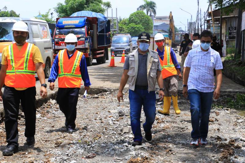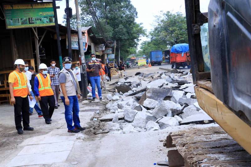 Wali Kota Tangerang H. Arief R. Wismansyah meninjau langsung proses perbaikan jalan rusak dengan tingkat kerusakan sedang hingga berat yang berlangsung di Jl. Pembangunan 3, Neglasari, Kota Tangerang, Sabtu (27/2).