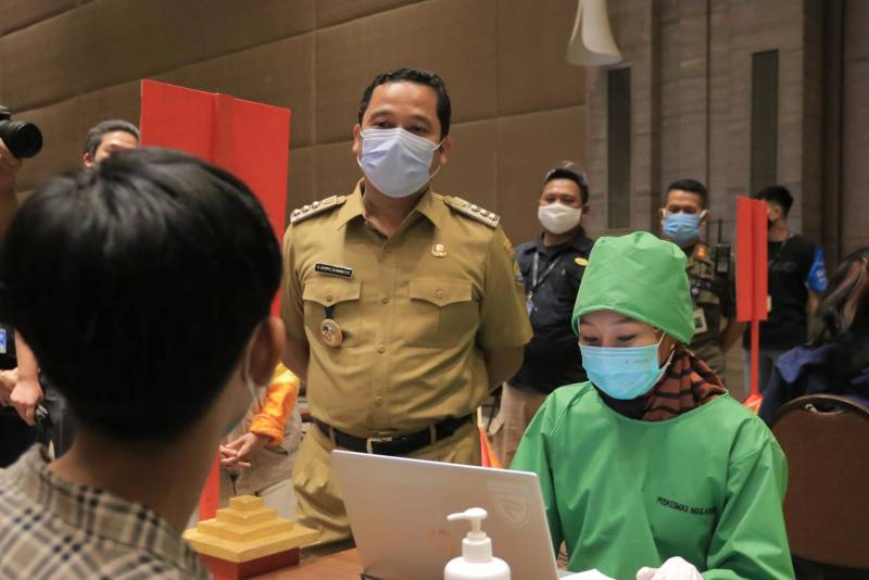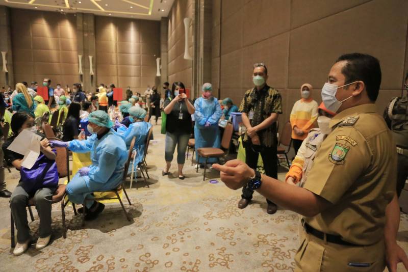 Wali Kota Tangerang H. Arief R. Wismansyah monitoring pelaksanaan vaksinasi tahap 2 dengan sasaran para pedagang atau pekerja yang melakukan pelayanan langsung kepada masyarakat, kegiatan ini dilaksanakan di Ballroom Hotel Novotel Tangerang City Mall, Senin (1/3/2021).