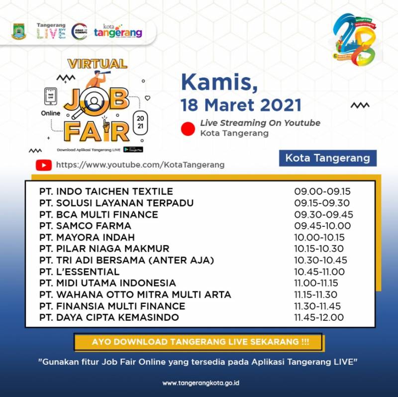 Pemerintah Kota Tangerang melalui Dinas Ketenagakerjaan (Disnaker), kembali mengadakan Virtual Job Fair, pada Kamis (18/03/21). Virtual Job Fair akan disiarkan secara langsung melalui kanal youtube Kota Tangerang.
