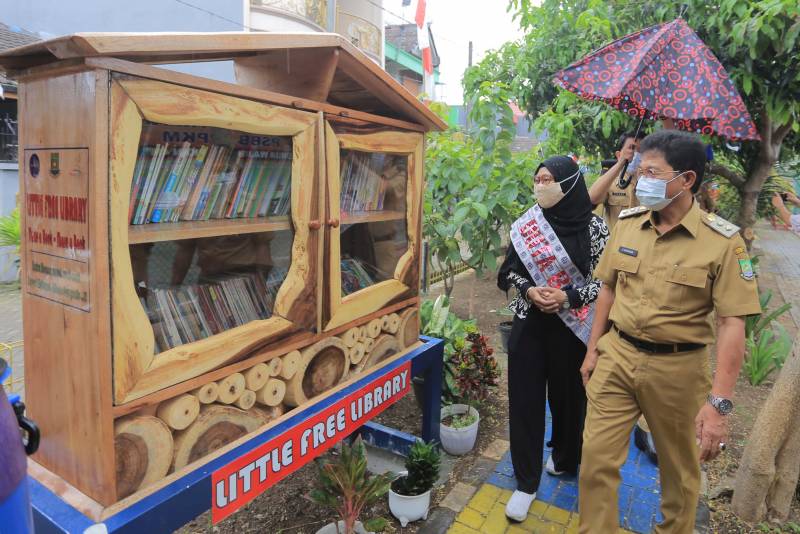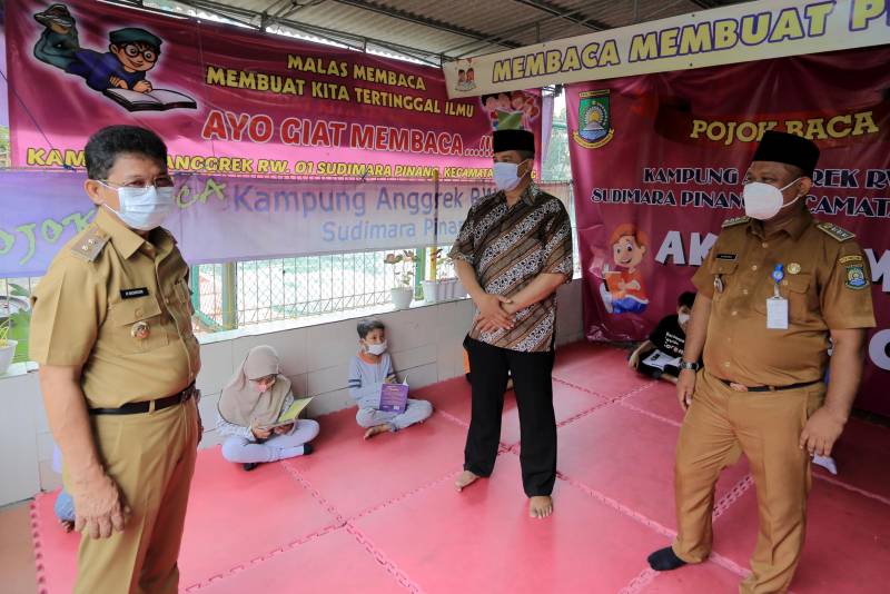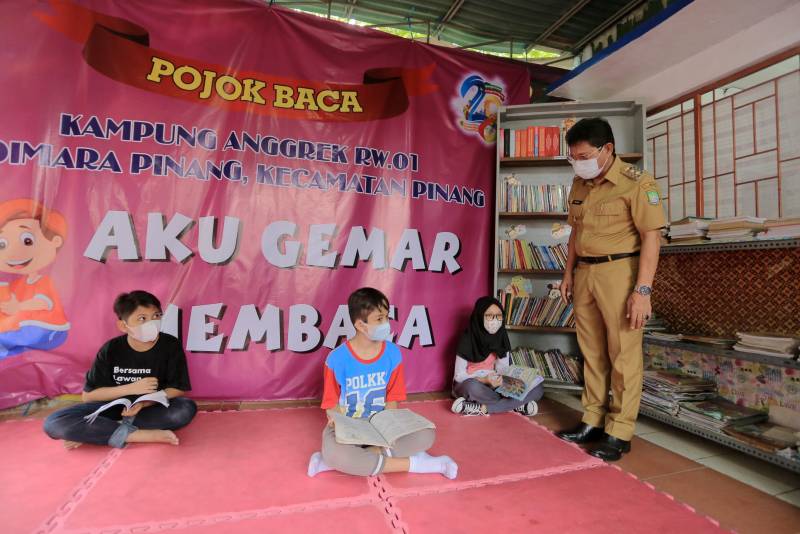 Wakil Wali Kota Tangerang H. Sachrudin didampingi Camat Pinang Kaonang meresmikan Little Free Library atau perpustakaan mini sebagai sarana bacaan bagi anak - anak yang bertempat di Kampung Anggrek RW. 01 Kelurahan Sudimara Pinang Kecamatan Pinang, Selasa (30/3/21).