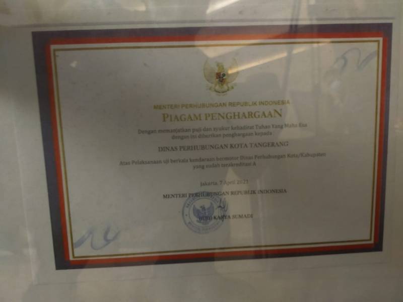Pemerintah Kota Tangerang melalui Dinas Perhubungan (Dishub) kembali meraih penghargaan Sertifikat Akreditasi A Unit Pelaksana Pengujian Kendaraan Bermotor (UPPKB) skala Nasional, dari Dirjen Perhubungan Darat Kementerian Perhubungan Republik Indonesia, pada Rakornis Perhubungan Darat 2021, di Hotel Crowne Plaza Jakarta Selatan, Kamis (8/4/21).