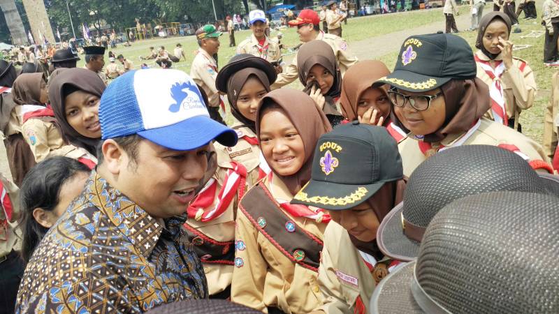 “Gantian ya,” ucapnya sambil melayani para anggota pramuka yang ingin berfoto bersamanya.