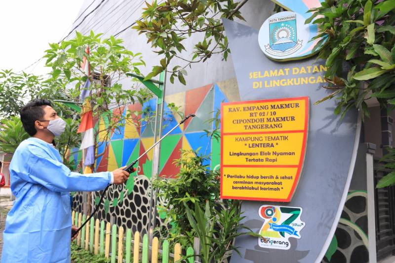 Seiring lonjakan kasus covid-19 diberbagai wilayah di Kota Tangerang, membuat sebagian warga melakukan antisipasi sedini mungkin dengan penyemprotan disinfektan. Seperti halnya yang dilakukan warga Kampung Lentera, Kelurahan Cipondoh Makmur, Kecamatan Cipondoh.