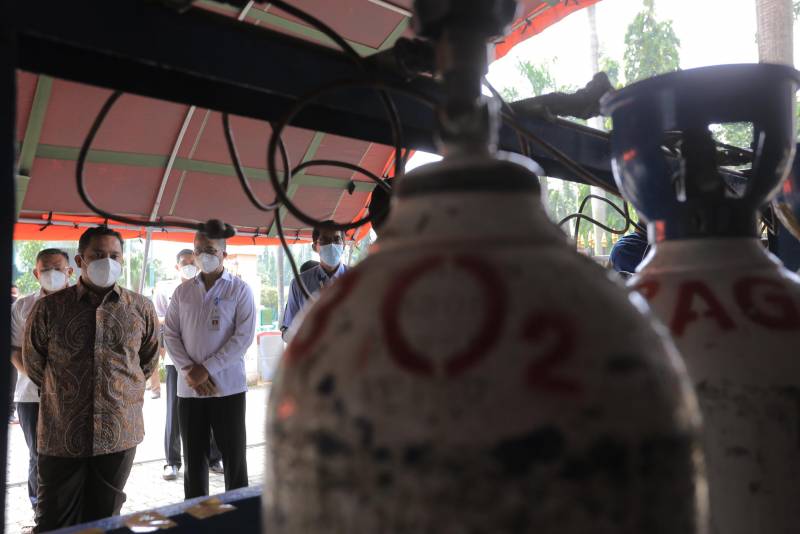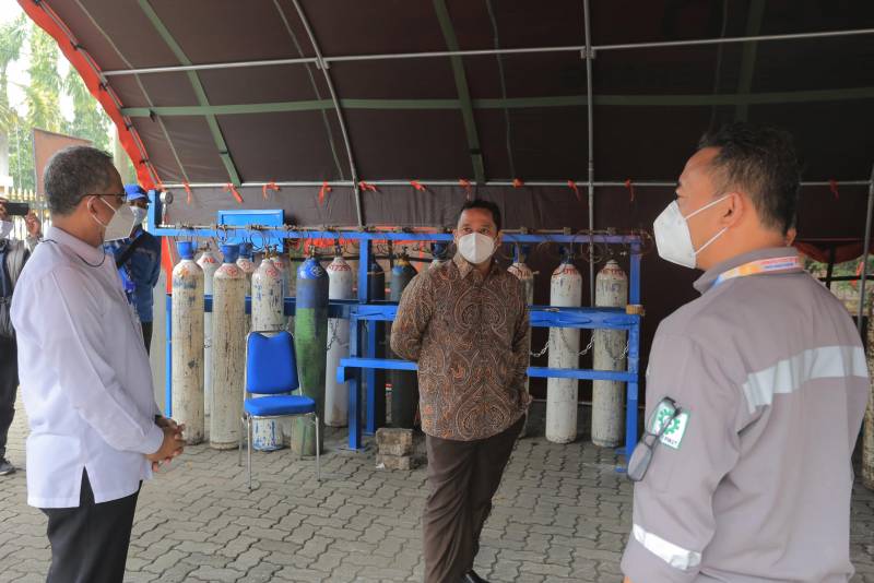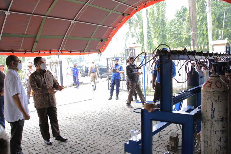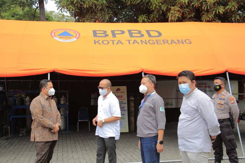 Wali Kota Tangerang H. Arief R. Wismansyah meninjau posko pengisian tabung oksigen kapasitas 1 M³ bagi masyarakat Kota Tangerang yang membutuhkan secara cuma - cuma.