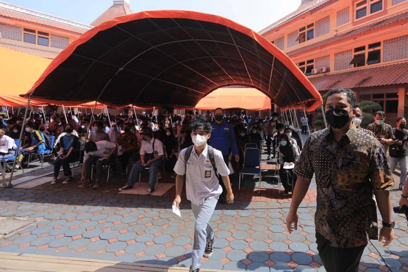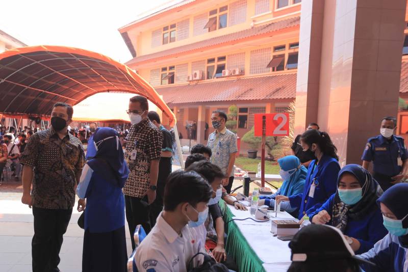 Hari ke dua vaksinasi bagi pelajar SMP dan SMA Negeri maupun Swasta di Kota Tangerang, terpantau para pelajar antusias berbondong - bondong datang untuk melakukan vaksinasi dan berjalan dengan kondusif di Gedung Pusat Pemerintahan Kota Tangerang, Kamis (2/9/21).