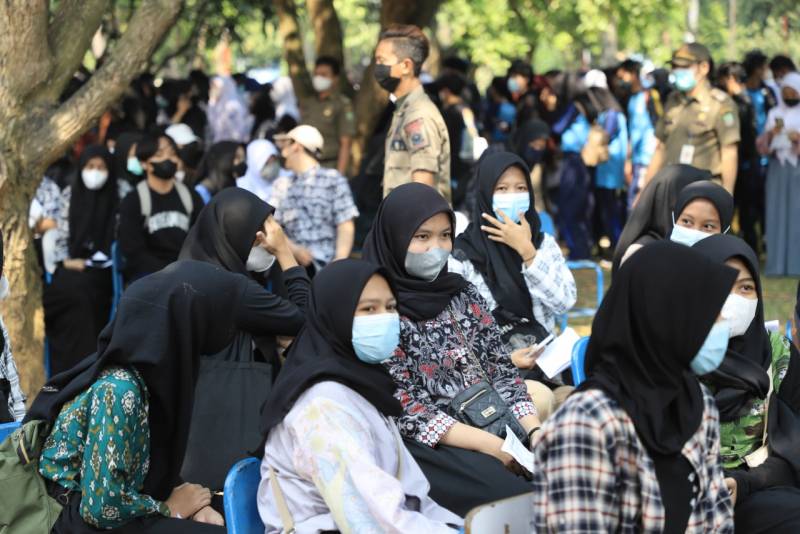 Antusias lebih tinggi terlihat dihari kedua pelaksanaan vaksinasi massal pelajar Kota Tangerang, di Puspem Kota Tangerang, Kamis (2/9/21). Diketahui, pada hari kedua ini vaksinasi massal didominasi pelajar tingkat SMA/SMK dengan 8.264 pelajar dari 17 sekolah. Ingin segera Pembelajaran Tatap Muka (PTM) menjadi semangat ribuan pelajar mengikuti vaksinasi, tak terkecuali sejumlah guru yang mendampinginya.