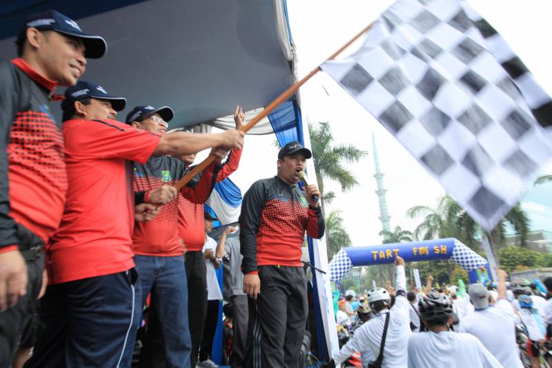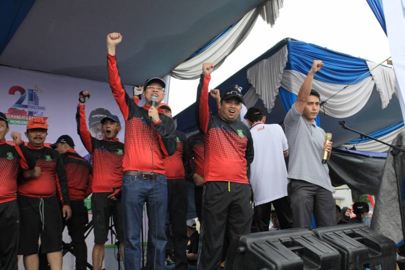 “Ayo yang bisa nyanyi dan memimpin senam saya kasih hadiah,” tantang Wali Kota kepada para peserta Sepeda Santai yang sudah memadati halaman Pusat Pemerintahan Kota Tangerang, Minggu (19/02).