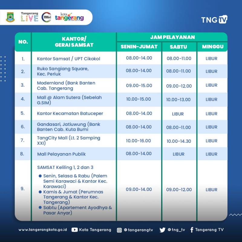 Oia, @samsat_cikokoltng juga telah membuka Pelayanan Samsat Keliling di beberapa lokasi lho sob.. Yuk simak informasi jadwal dan persyaratannya