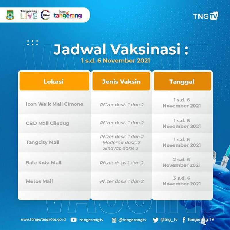 Dinas Kesehatan bersama Dinas IndagkopUKM Kota Tangerang menggelar sentra vaksinasi pada 1 s.d. 6 November 2021 di beberapa pusat perbelanjaan di Kota Tangerang.