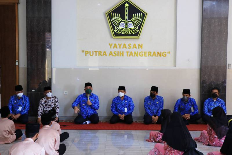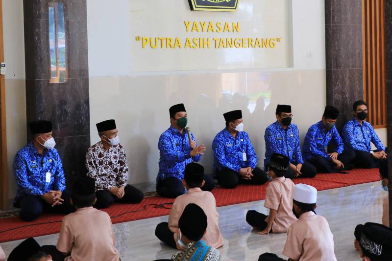 Wali Kota Tangerang H. Arief R. Wismansyah bersama Sekretaris Daerah Kota Tangerang Herman Suwarman serta beberapa kepala OPD Pemerintah Kota Tangerang memberikan santunan langsung kepada anak yatim di Yayasan Putra Asih Tangerang, Rabu (17/11/21).
