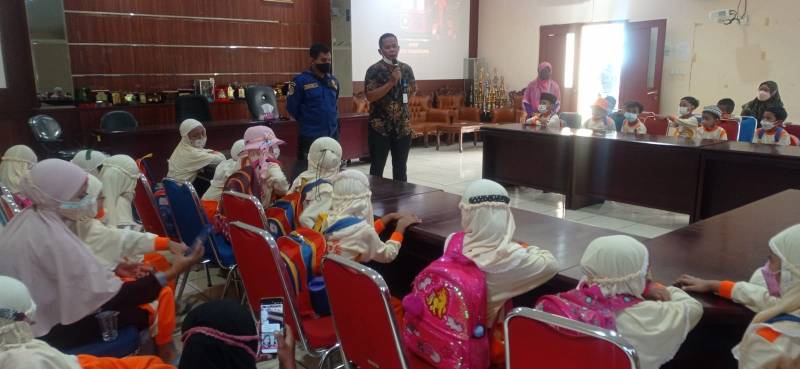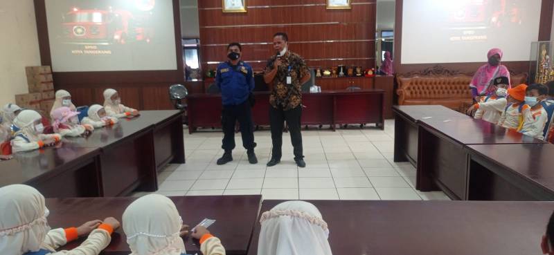 BPBD Kota Tangerang memberikan edukasi tentang mitigasi bencana dan kebakaran kepada puluhan anak-anak RA Athfal Nurul Falah Cadas, Kecamatan Sepatan, Kabupaten Tangerang, yang mendatangi langsung markas besar BPBD Kota Tangerang, di Jalan KS Tubu, Koang Jaya, Kecamatan Karawaci, Kamis (25/11/21).