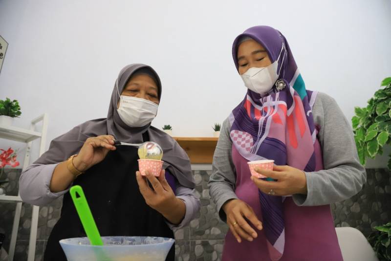 “Awalnya ngeliat hasil KWT yang melipah (sukun) tapi cuman diolahnya, ya direbus, digoreng atau dikukus. Lalu saya coba buat bolu gagal coba lagi, gagal coba lagi sampai akhirnya bisa seperti ini,” ucap Isbandiyah.